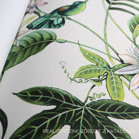 Stylistyka tapety 106975 to propozycja dla miłośników niebanalnego wystroju wnętrz. Zainspirowana dziką naturą, dzięki elementom stylu tropikalnego i glamour może zostać użyta także w eleganckim pomieszczeniu. Rytmiczny motyw, zaczerpnięty z bogactwa egzotycznej flory i fauny, stworzy jedyny w swoim rodzaju wystrój, w którym nie będzie czasu na stagnację i nudę. Wzór o przesunięciu 64cm proponuje ornamentykę z lekką grą światłocienia, tworzącego niezwykłą głębię i wrażenie trójwymiarowości.